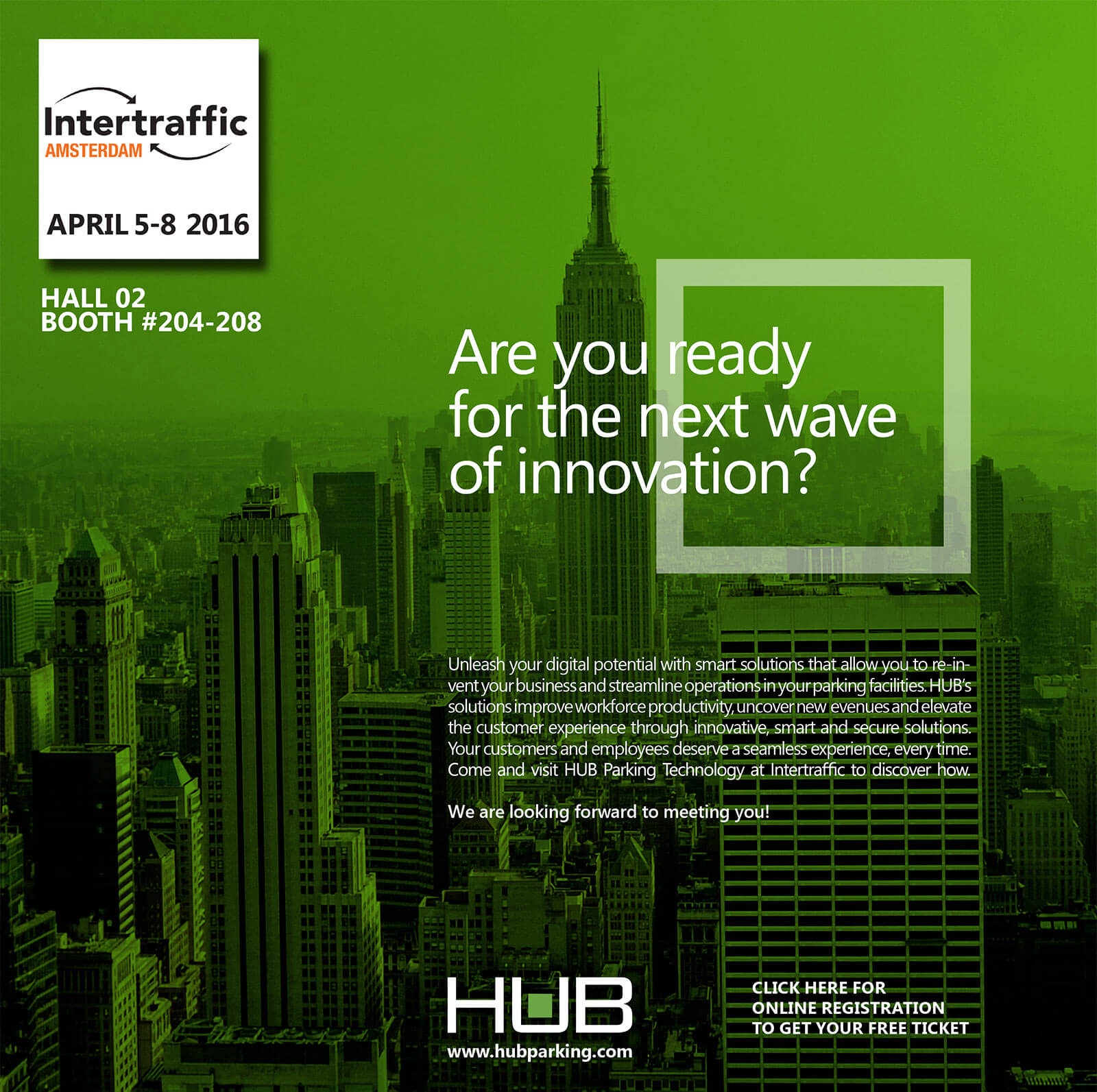 Are you ready for the next wave of innovation? HUB Parking Technology will be at Intertraffic Amsterdam 2016. Come visit us at booth 02.204-02.208 to discover the latest additions to our range, we are looking forward to meeting you!