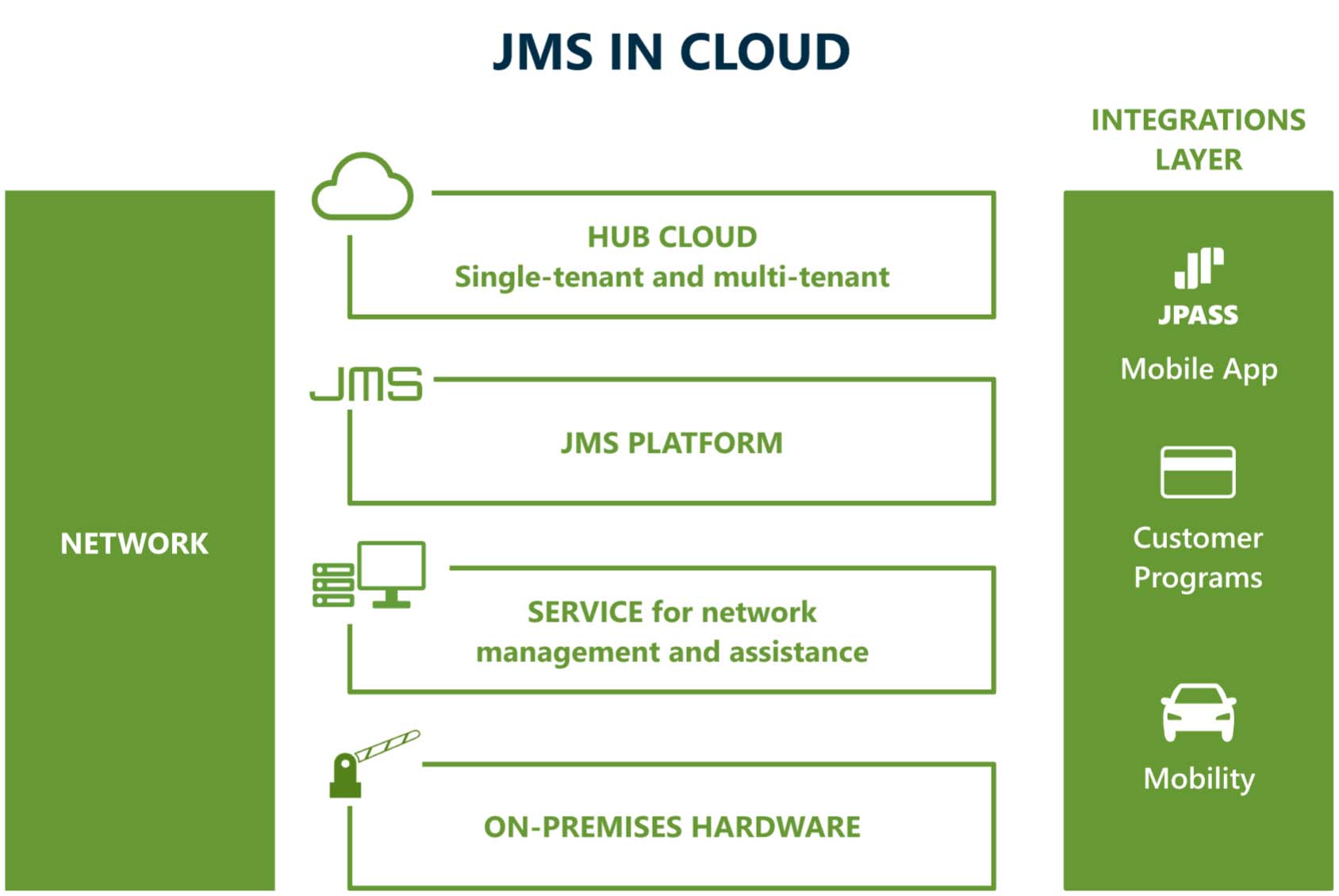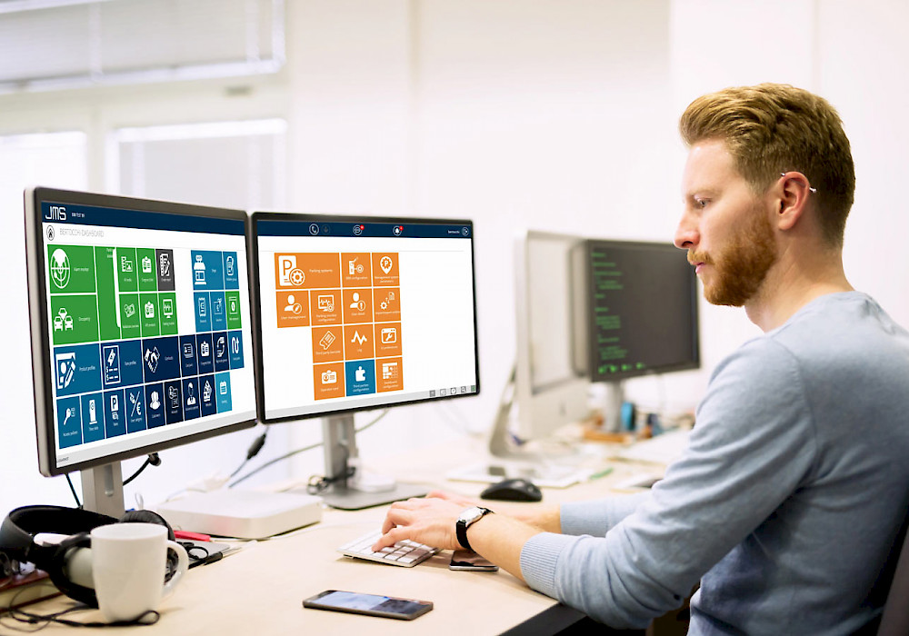 Each car park is considered a separate tenant, and it is managed from a JMS central access point that provides real-time data on all available parking spaces.