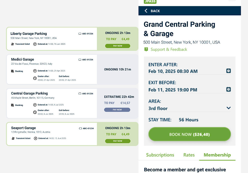 Users can independently search, book, pay for a spot in advance, and update their parking reservation through JPass for mobile (iOS and Android) or web. Onsite, JPass acts as access medium relying on Bluetooth technology embedded in the parking peripherals, or QR code reading at the entry machine, in full contactless mode.